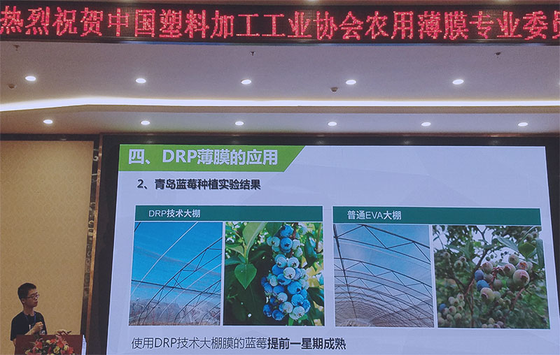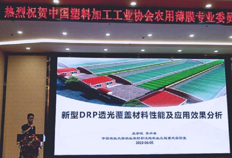 会上,各专家教授从新技术、科研成果、应用领域等角度阐述了农膜行业未来的发展趋势,引发了现场的广泛讨论。中国农业大学代表发表了主题为《新型DRP透光覆盖材料性能及应用分析》报告,报告阐述了DRP薄膜关于透光、保温、力学性能、消雾流滴和环保性等优异性能的实验分析及应用分析。